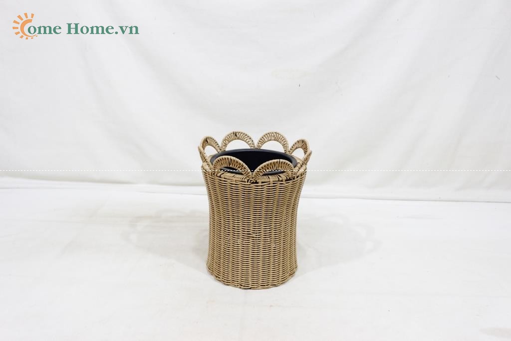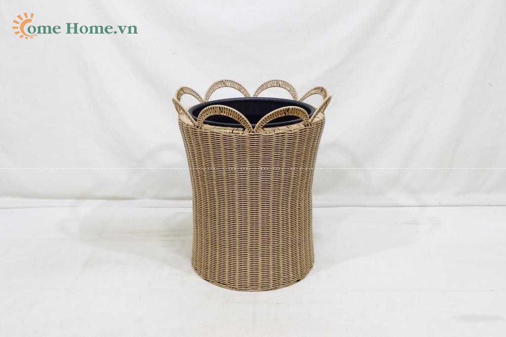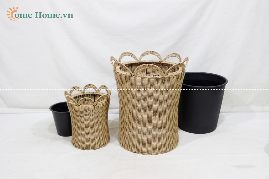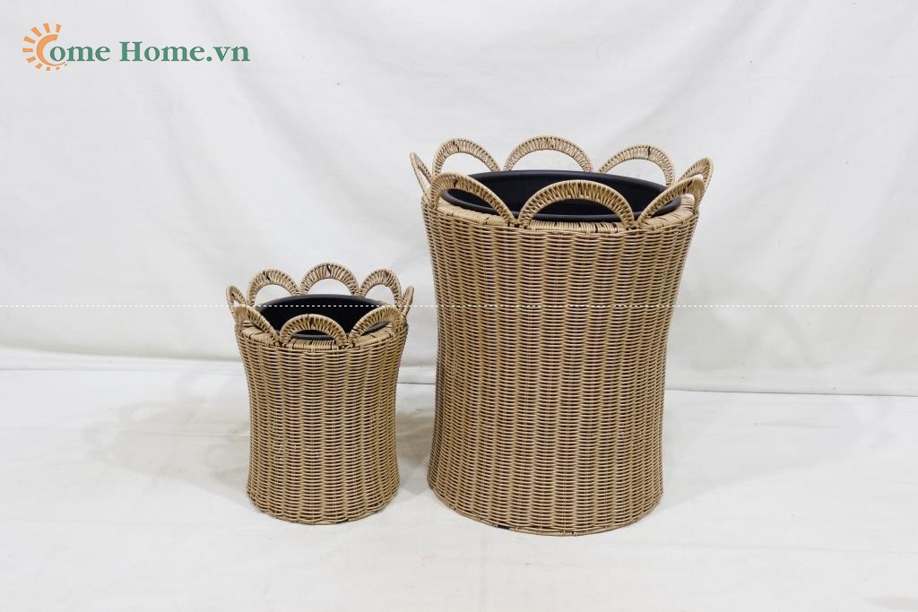 Description: Set of 2 round poly rattan planters, normal weave, brown color, black plastic pot inside.